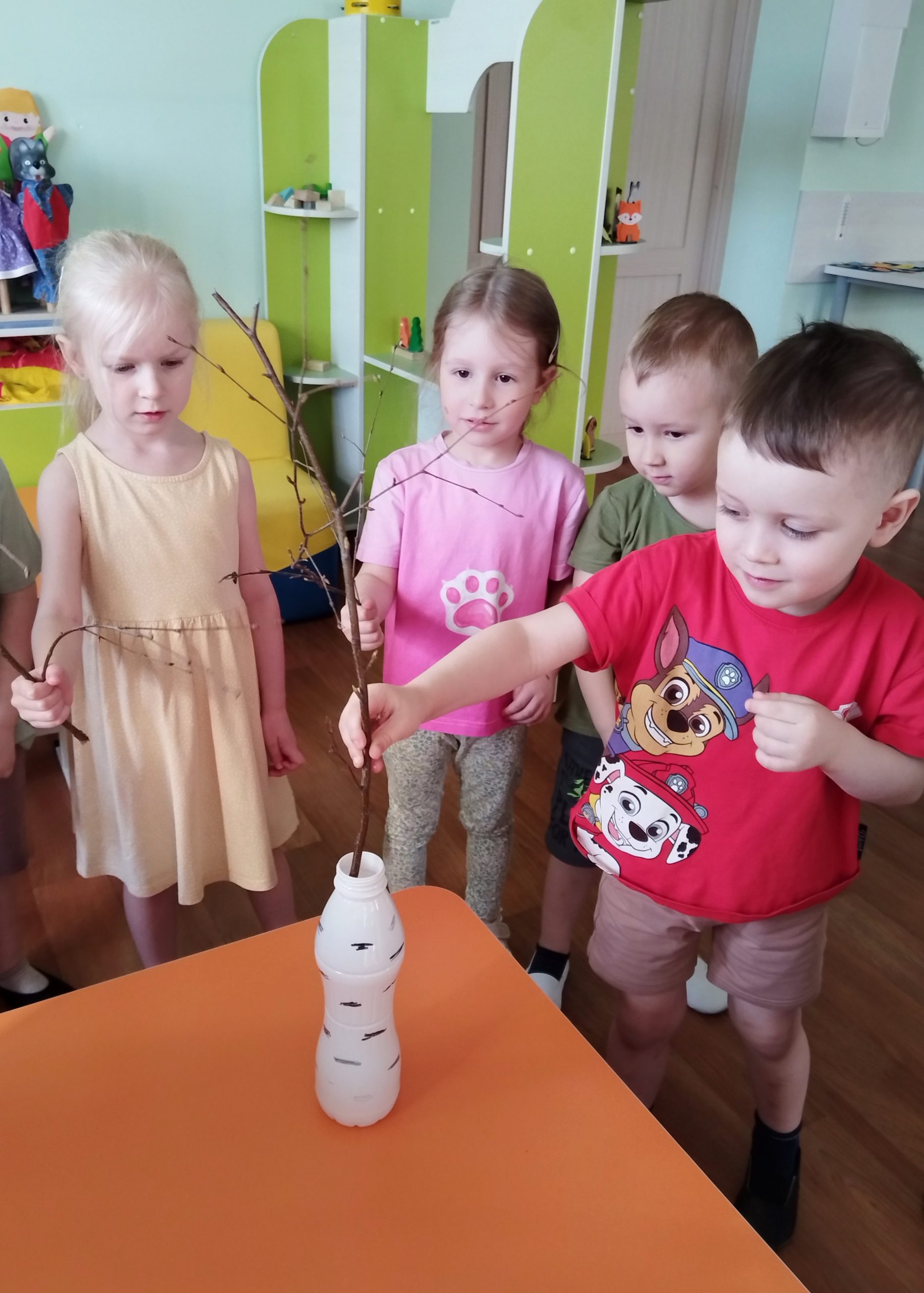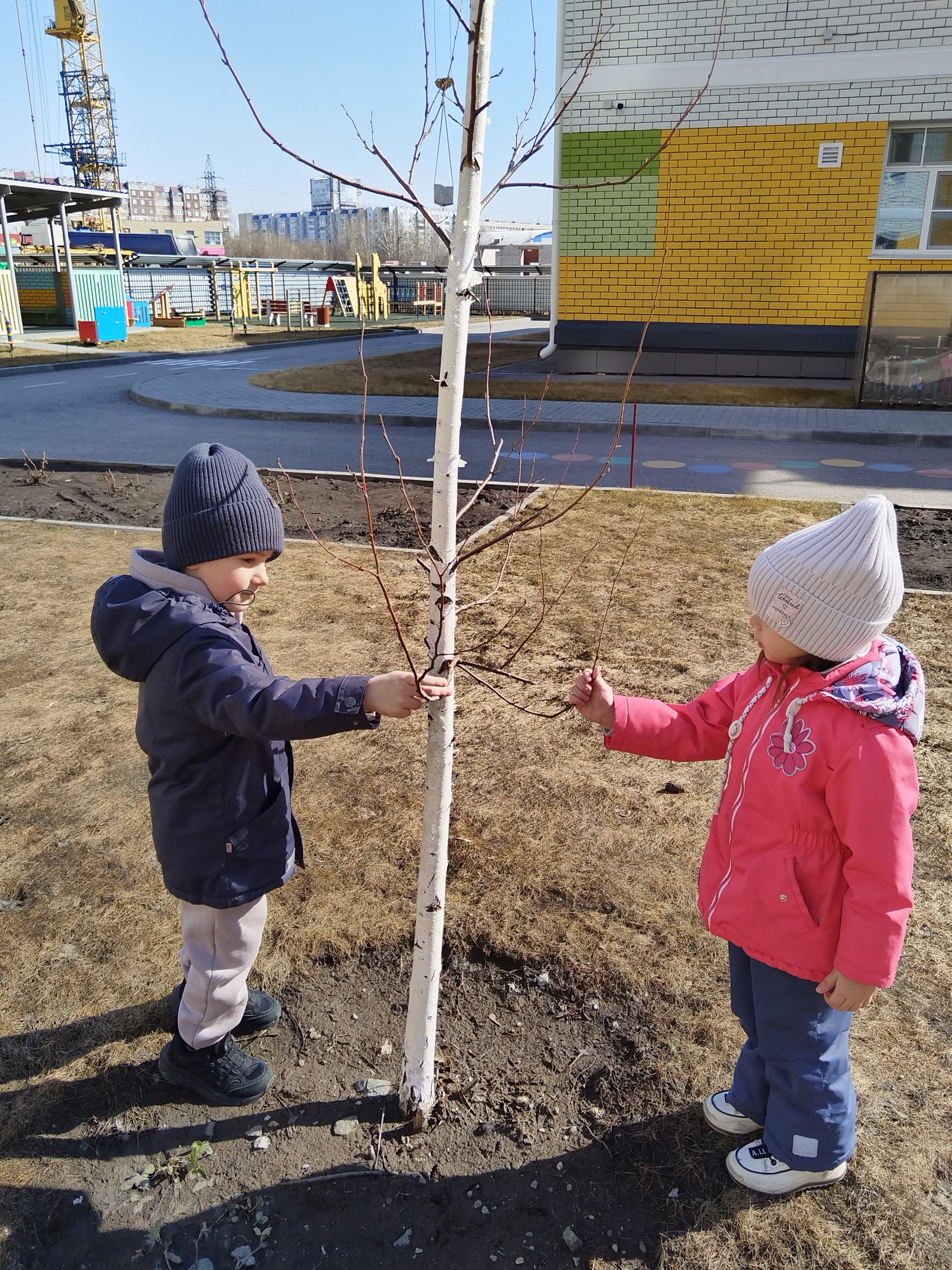 В ходе тематического дня ребята закрепили знания о том, что белая берёзка – дерево и символ России, символ красоты русской природы, она прекрасна в любое время года. Узнали что, наши предки с давних времён о ней слагали песни, водили вокруг неё хороводы, сочиняли пословицы, загадки, стихи и сказки. Также дети узнали, какую пользу берёза приносит человеку, о свойствах берёзы и о том, что русская берёза является символом добра и красоты, символом родной земли. По территории детского сада с воспитанниками группы была проведена экскурсия, во время которой дети наблюдали за берёзками, а воспитатель рассказала о самом дереве. В группе ребята рассматривали иллюстрации с изображением берёз, читали художественную литературу, прослушивали музыкальные произведения по теме, рисовали «Листочки для берёзки». А также поставили в воду берёзовые веточки, за которыми теперь будут наблюдать и ждать когда появятся листочки.