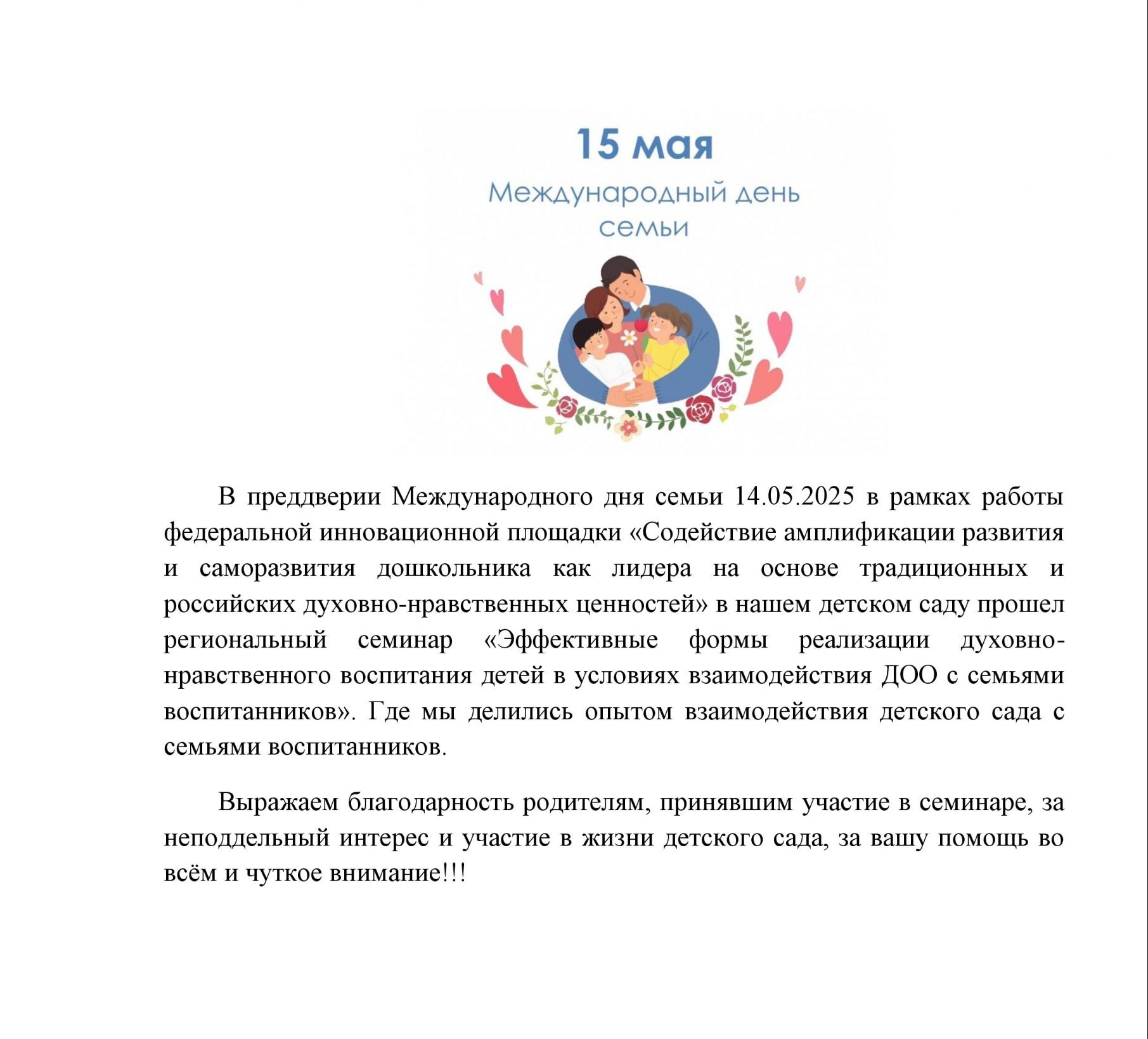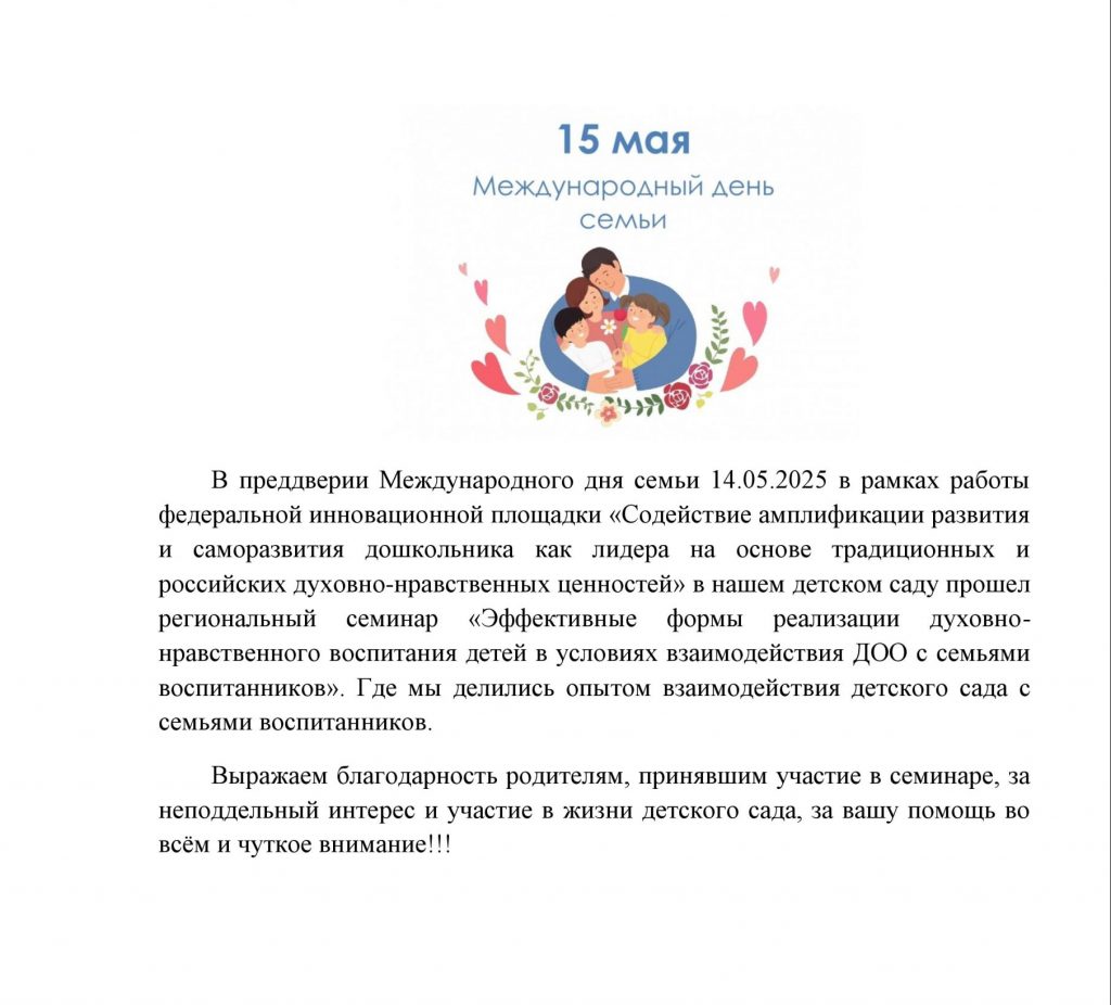 Международный День семьи сайт15 мая, 2025 Новости Комментариев нет ← Воспитанники посадили на участке детского сада ёлочки Мероприятие на базе нашего детского сада в рамках Всероссийской научно-практической конференции → Добавить комментарий Отменить ответВаш адрес email не будет опубликован. Обязательные поля помечены *Комментарий Имя * Email * Сайт Сохранить моё имя, email и адрес сайта в этом браузере для последующих моих комментариев.