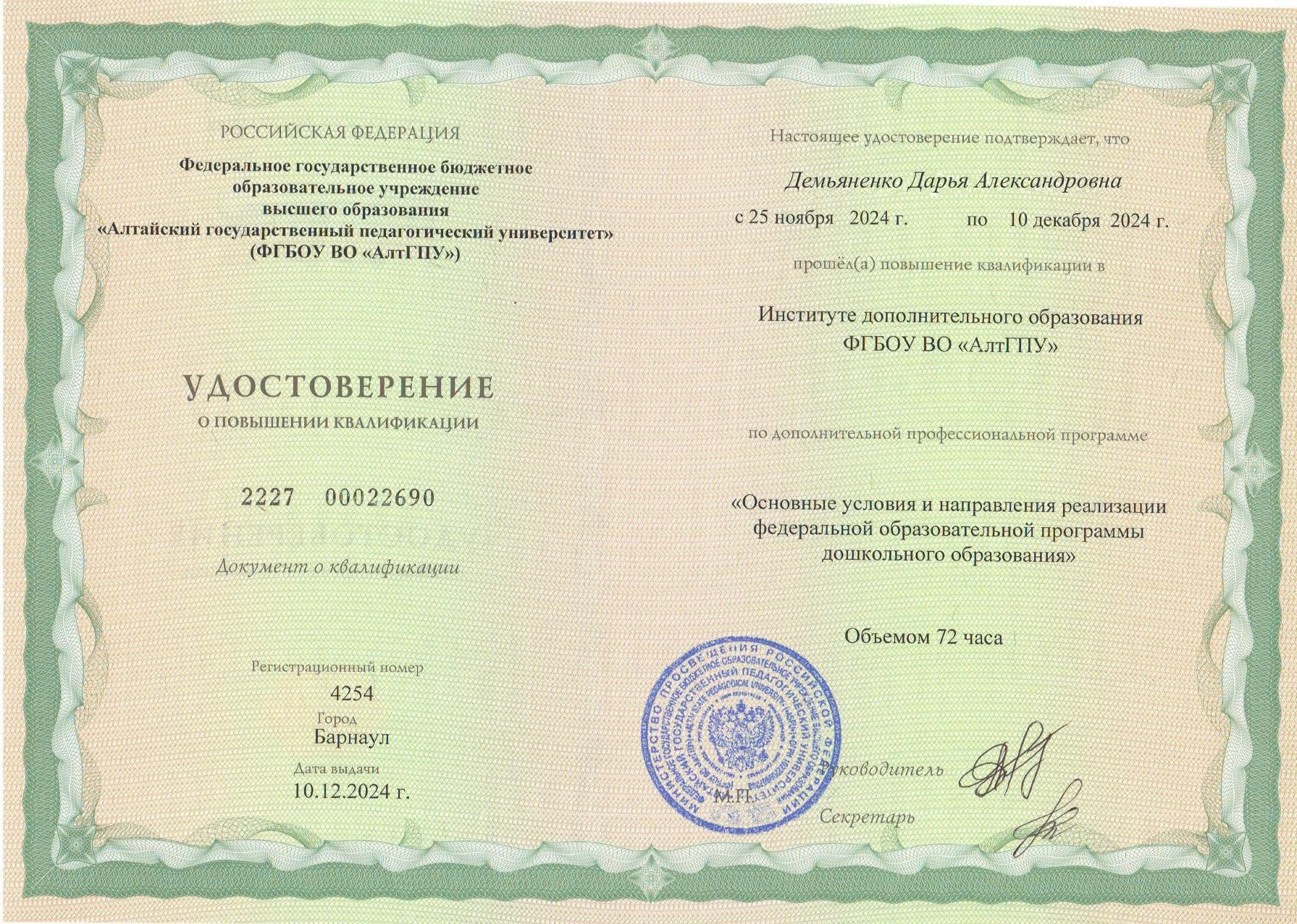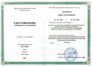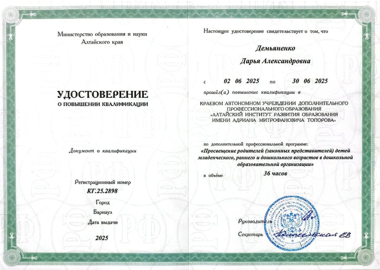 Сведения об образовании: Среднее специальное педагогическое, 2024 год, «Барнаульский Государственный педагогический колледж имени В. К. Штильке», специальное дошкольное образование