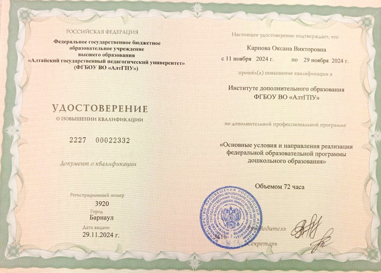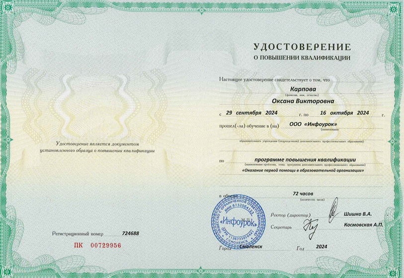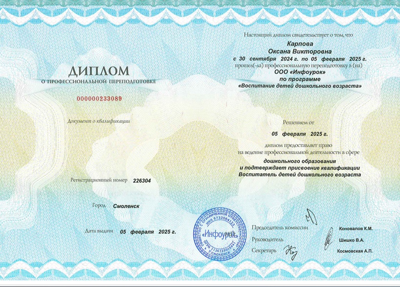 Воспитатель Карпова Оксана Викторовна
