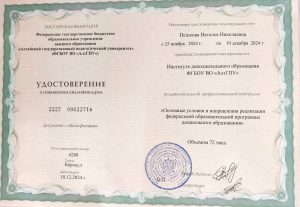 Курсы повышения квалификации: Федеральное государственное бюджетное образовательное учреждение высшего образования «Алтайский государственный педагогический университет» (ФГБОУ ВО «АлтГПУ», август 2020, «Психолого-педагогическое сопровождение детей с ОВЗ и детей-инвалидов в дошкольной образовательной организации».